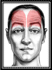 El vientre frontal: El músculo frontal es un músculo cutáneo del cráneo. Algunos autores lo consideran la porción muscular anterior del músculo occipitofrontal. Se halla inervado por los filetes frontales de la rama temporoficial del nervio facial. Si el músculo frontal se contrae aisladamente, conduce hacia adelante la aponeurosis epicranea, elevando la piel de las cejas. En la expresión de fisonomía el frontal es el músculo de la atención, y la manifiesta en sus diferentes grados, desde la simple sorpresa hasta admiración y el espanto.